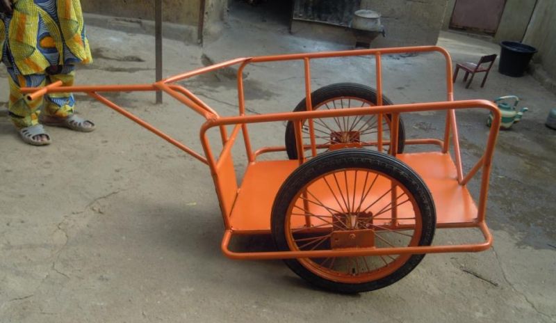 We hoorden dat de kruiwagens ideaal waren maar op geaccidenteerde terreinen sloegen ze om als ze te zwaar geladen waren. Een goed alternatief bleek de zogenaamde pousse-pousse (pousser=duwen), karretjes op twee wielen te zijn.